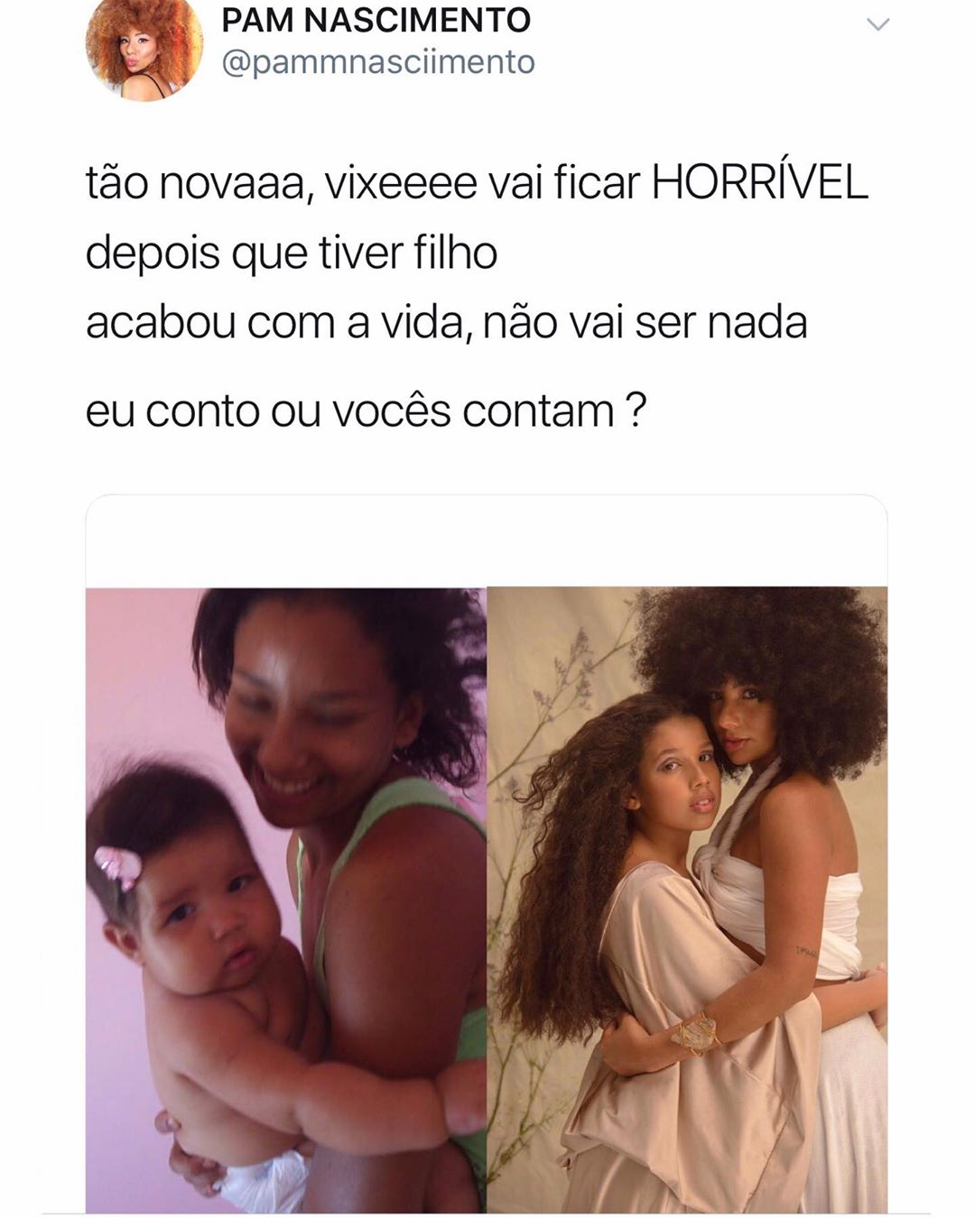 Mãe solo de Luna, 11, Pam compartilha abertamente a relação com sua filha, trocando e motivando outras mães a repensar a maternidade partindo da educação social, racial e de empoderamento que irão garantir a autoestima dessas crianças. A ativista enfatiza a beleza dos seus corpos pós maternidade e se enxergando no lugar de mulheres livres e independentes para além de mães